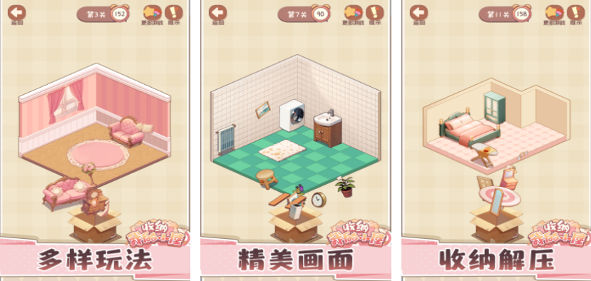 比较喜欢休闲类游戏的玩家,可以尝试一下收纳我的小屋2在这里面会打造一个立体的场景,玩家需要把床放在纸箱里的物品摆放到场景中,每一个场景都有特定的位置,只有完全正确的摆放才能进入到全新的关卡中,游戏里的场景各不相同,每一个都有不同的风格供玩家挑战。