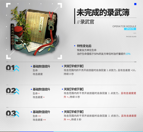 特性变化:通常不攻击且挡0,技能没开启时40秒内攻击力逐渐提升到最高+200%,且技能结束时重置攻击力部署后获得+100%加成。