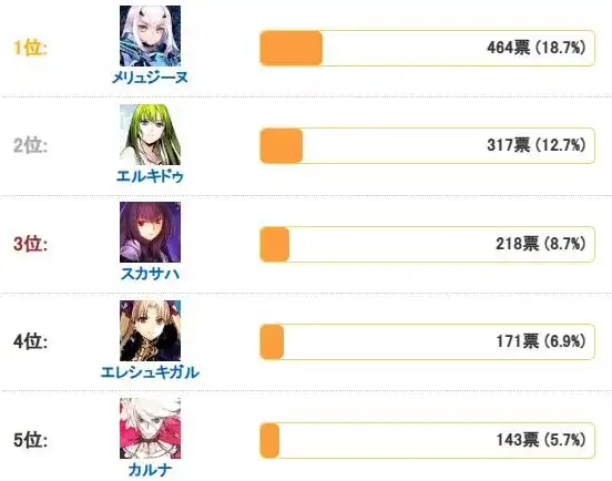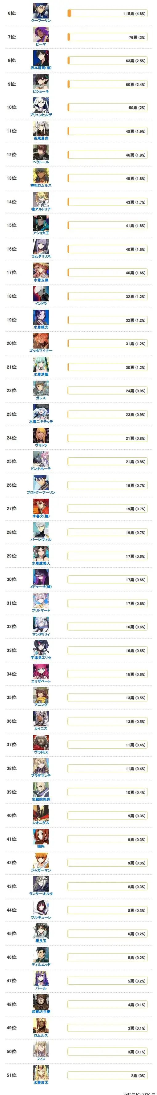 然后是剩下的其他枪阶从者的得票情况,大狗能在第六位感觉有点意外又在情理之中,感觉这么多年大狗的人气还是没下降,怖军和比修内都算是不错的单体,这次的票数不高感觉还是持有率的问题。